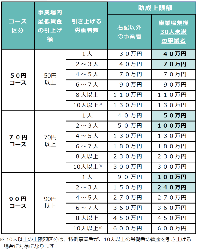 令和7年度は事業場内最低賃金と地域別最低賃金の差額が50円以内の事業所が対象とされていましたが、令和8年度は事業場内最低賃金が令和8年度改定後の地域別最低賃金額未満までの事業所が対象と拡充されました。