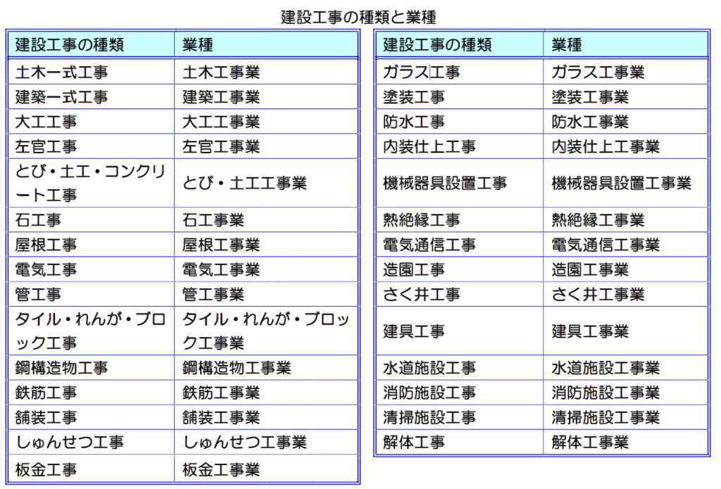 建設工事は、土木一式工事と建築一式工事の2つの一式工事と、27の専門工事に分類されています。